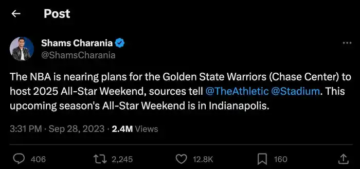 El periodista Shams Charania comunicó en X una noticia que muchos en la NBA estaban ansiosos por conocer: la sede del All-Star Game de la NBA 2025. Todo indica que se confirmará pronto, y se trata del Chase Center, el estadio en el que juegan los Golden State Warriors.
