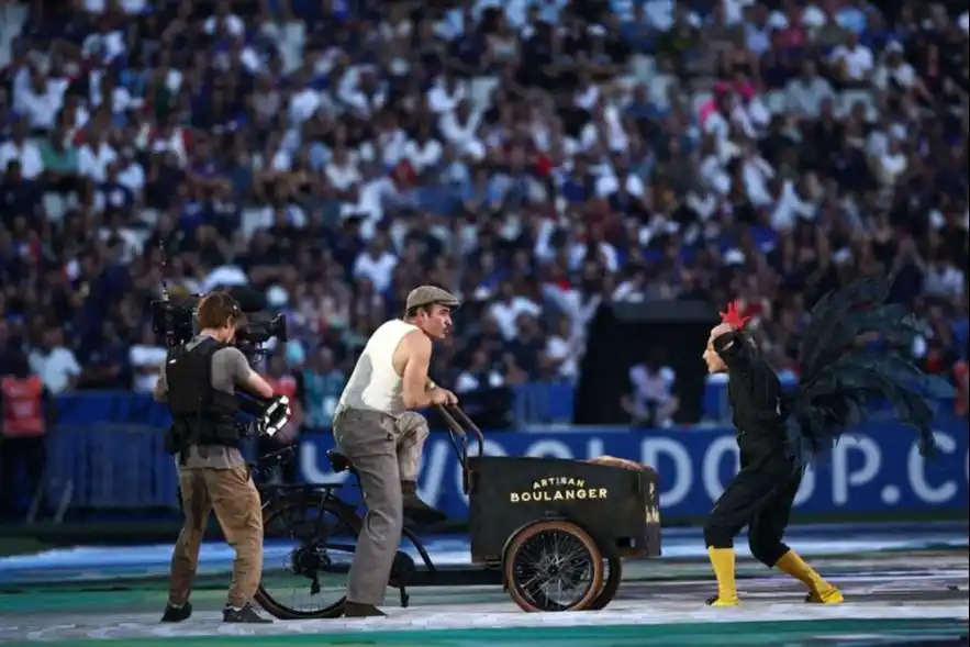 Jean Dujardin, actor ganador del Oscar en 2011, fue el artífice y protagonista de la performance que cautivó al Stade de France. Con más de 300 artistas, banderas de todos los seleccionados, colores de todo tipo, vestimentas y tradiciones galas y una imponente Torre Eiffel en cuya punta reposaba la Copa Webb Ellis, la ceremonia cumplió con creces.