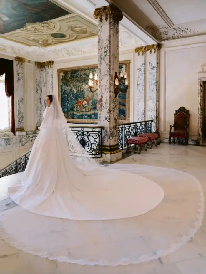 El impresionante vestido de fiesta de manga larga presentaba cuello redondo y cintura caída, y estaba combinado con un velo de encaje de 16 pies y un maquillaje mínimo: sin rímel ni gel para cejas. "No quería que rezumara sexo de ninguna manera", le dijo a Vogue sobre su look nupcial.