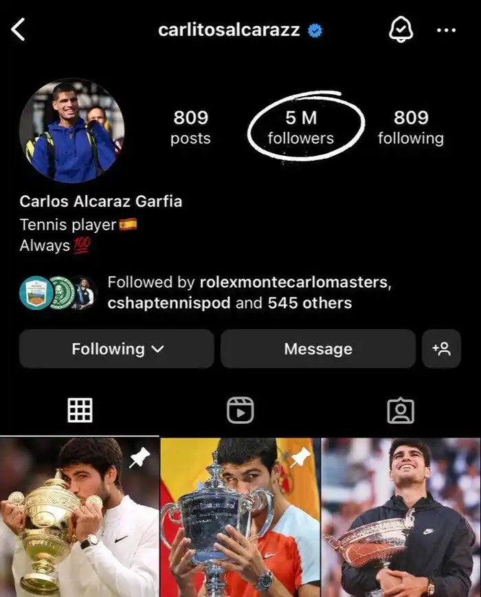 Después de que Carlos Alcaraz ganara su primer Abierto de Francia, que es el tercer título de Grand Slam de su carrera, sus seguidores de Instagram se dispararon recientemente, hasta alcanzar la marca de los 5 millones. Ahora tiene más seguidores que nunca.