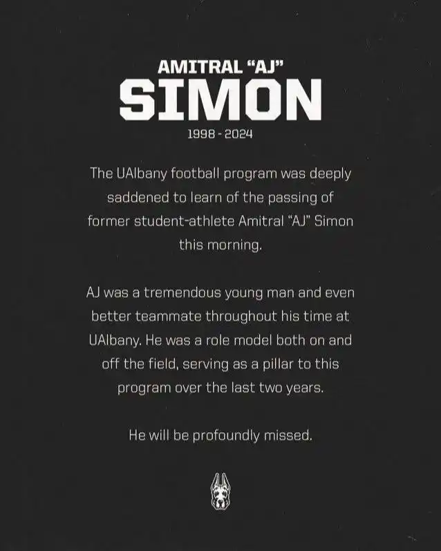 “El programa de fútbol americano de UAlbany está profundamente conmovido al conocerse el fallecimiento del ex atleta-estudiante Amitral ‘AJ’ Simon esta mañana. AJ fue un joven prometedor e incluso mejor compañero durante su tiempo en UAlbany. Fue un modelo a seguir dentro y fuera del campo, sirviendo como un pilar para este programa a lo largo de los últimos dos años”.