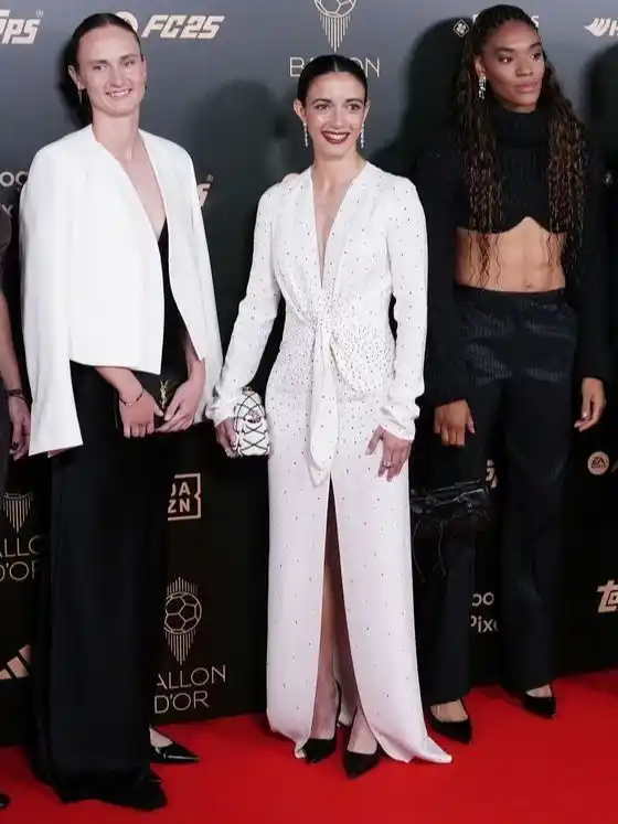La gran protagonista de la noche fue Aitana Bonmatí, del Barça, que se llevó su segundo Balón de Oro consecutivo. Escogió un vestido blanco confeccionado con cady y seda de Louis Vuitton. El diseño constaba de un bordado de pedrería gris, escote en 'V', lazada en el torso y apertura en la falda. De esta manera, se podían observar los zapatos de salón destalonado que acompañó con pendientes de la colección 'Galaxie' en oro blanco y diamantes.
