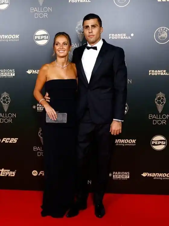 El hombre de la noche. Rodri Hernández, flamante Balón de Oro masculino, estuvo en París junto a su pareja Laura Iglesias. Los dos apostaron por el negro, él con esmoquin y ella con un vestido largo con escote palabra de honor y clutch de pedrería.