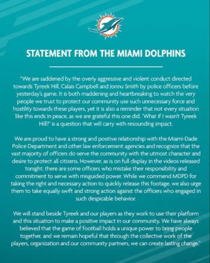 El video despertó la inmediata reacción de los Miami Dolphins, que mostraron su preocupación por la forma en la que la policía trató a su jugador. En redes sociales, esbozaron un comunicado en donde también se referían a las detenciones de otros dos de los suyos, Calais Campbell y Jonnu Smith, además de Hill. “Nos entristece la conducta excesivamente agresiva y violenta dirigida hacia Tyreek Hill, Calais Campbell y Jonnu Smith por parte de los agentes de policía antes del juego de ayer. Es desgarrador ver a las mismas personas en las que confiamos para proteger a nuestra comunidad usar una fuerza tan innecesaria hacia estos jugadores”, escribieron.