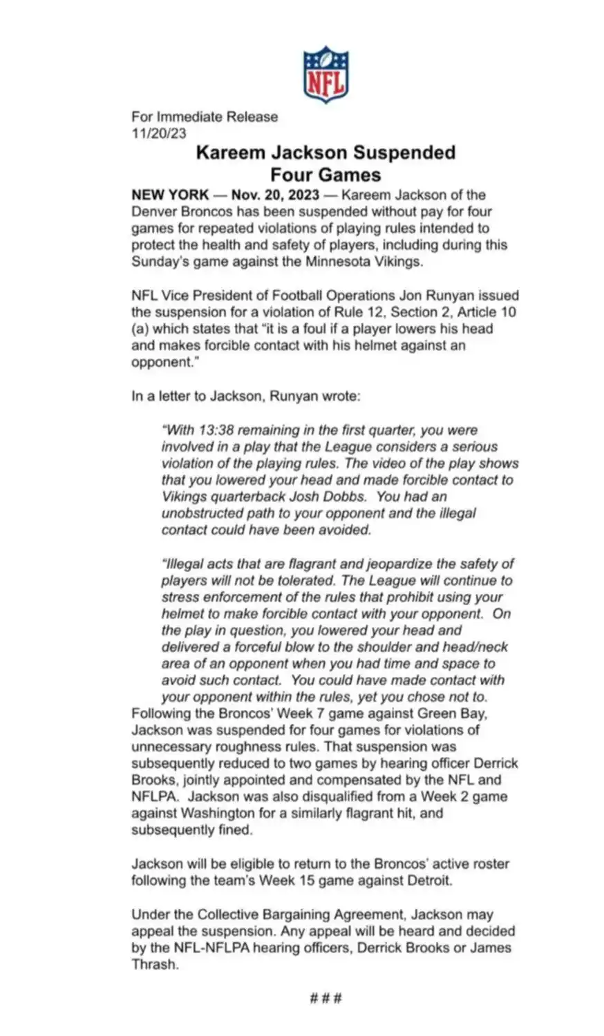 El domingo pasado, solo un puñado de partidos después de regresar de su suspensión, Jackson volvió a violar las reglas cuando golpeó con su cabeza el pecho de Joshua Dubbs, de los Vikings. El 15 de Minnesota estaba tomado y con el balón en su mano izquierda cuando Jackson apareció a toda velocidad y se lo hizo volar de forma ilegítima. Luego del encuentro, la NFL determinó una nueva suspensión de 4 partidos para el de los Broncos.