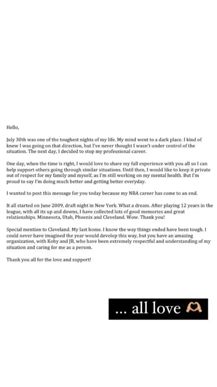 Todo empezó en junio de 2009, la noche del draft en Nueva York. Qué sueño. Después de jugar 12 años en la liga, con todos sus altibajos, he acumulado muchos buenos recuerdos y excelentes relaciones. Minnesota, Utah, Phoenix y Cleveland. Guau. ¡Gracias!