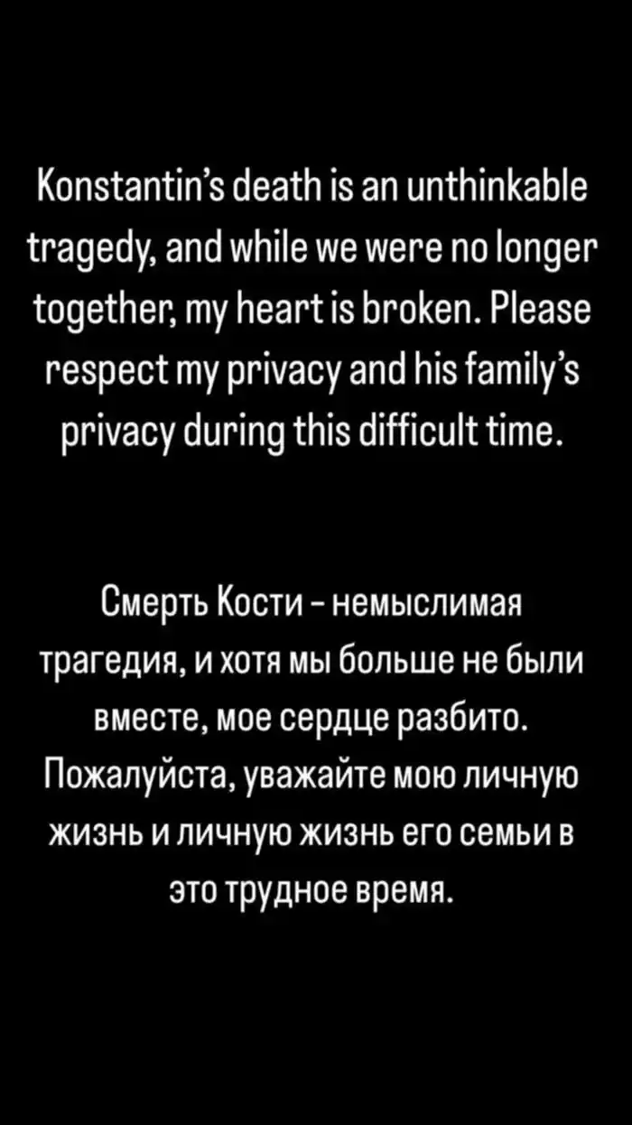 "La muerte de Konstantin es una tragedia inimaginable, y, aunque ya no estábamos juntos, mi corazón está roto. Por favor, respetad mi privacidad y la de su familia durante estos complicados tiempos”, expresó la actual número 2 del mundo, Aryna Sabalenka, en una historia en su cuenta de Instagram.