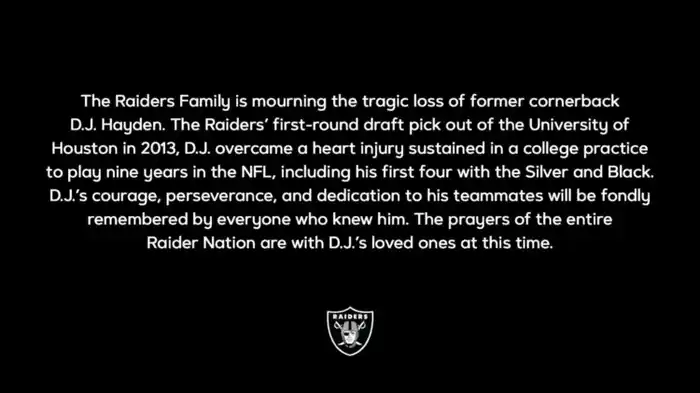 “La familia de los Raiders lamenta el trágico fallecimiento de D.J. Hayden. El coraje, la perseverancia y la dedicación de D.J. para con sus compañeros siempre será recordada con cariño por los que lo conocieron. Toda la Raider Nation manda sus oraciones para los que aman a D.J. en este complicado momento”, escribieron.