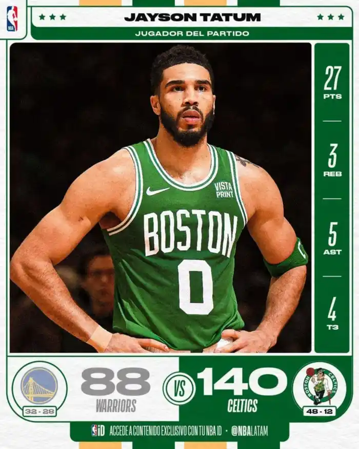 Los Boston Celtics aplastaron a los Golden State Warriors de Stephen Curry por 140-88, siendo esta la tercer victoria más abultada de sus casi 80 años de historia en la NBA. En tan solo la primera mitad, el equipo de Boston se impuso por un asombroso marcador de 82-38, la mayor ventaja al descanso en la historia de la franquicia y a su vez el mayor déficit de los Warriors.