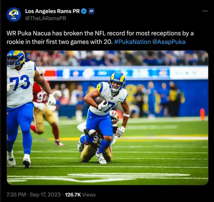 A pesar de la derrota por 30-23 frente a los San Francisco 49ers, Nacua fue noticia porque llegó a las 20 recepciones en la temporada, tras dos partidos, y superó a Earl Cooper, que desde 1980 era el rookie con mayor cantidad de recepciones en sus primeras dos semanas en la NFL. Además, cosechó 15 contra los 49ers, lo que también lo convirtió en el debutante con más atrapadas en un solo partido, en toda la historia de la liga.