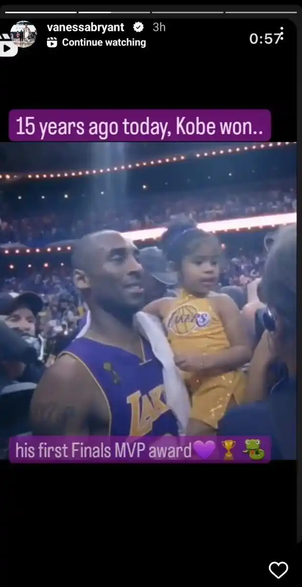 En su Instagram, Vanessa subió un video que celebraba el 15 aniversario del momento en que Kobe Bryant ganara su primer MVP de las Finales. No proporcionó ningún título de ningún tipo mientras lo hacía, sino que optó por recordar en silencio.